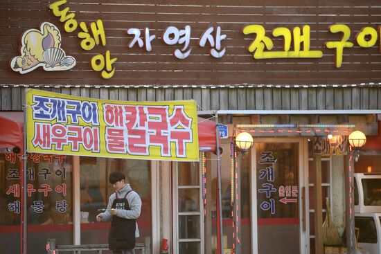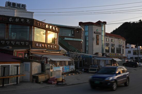 Tourists pose for a photo against the background of The Sun Cruise Resort & Yacht hotel in Jeongdongjin, South Korea.14.02.2017#3028683