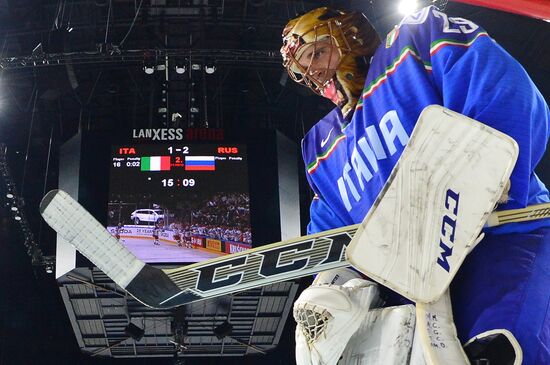 Italy's goalie Frederic Cloutie, center, fails to make a save during the 2017 IIHF World Championship group stage match between the Russian and Italian national teams.07.05.2017#3093193