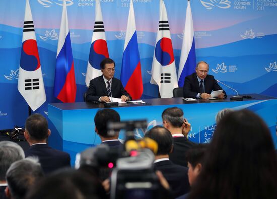 September 6, 2017. Russian President Vladimir Putin and President of South Korea Moon Jae-in, left, during a joint press statement on the results of the meeting held as part of the 3rd Eastern Economic Forum at the Far Eastern Federal University, Russky Island.06.09.2017#3186574