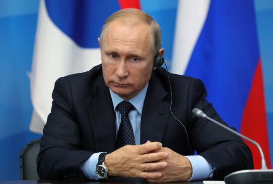 September 6, 2017. Russian President Vladimir Putin during a meeting with representatives of foreign business circles as part of the 3rd Eastern Economic Forum. The Far Eastern Federal University, Russky Island.06.09.2017#3186642