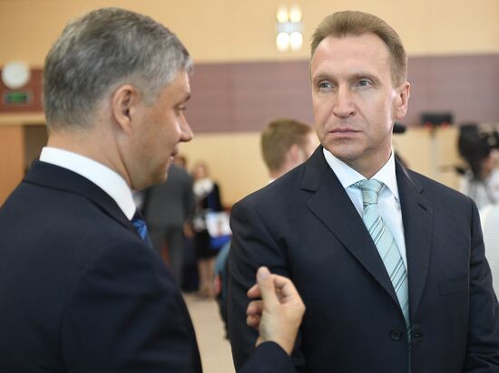 September 6, 2017. President and Board Chairman of the Russian Railways Oleg Belozyorov, left, and First Deputy Prime Minister Igor Shuvalov before a meeting of the Presidium of the State Council. The Far Eastern Federal University, Russky Island.06.09.2017#3186768