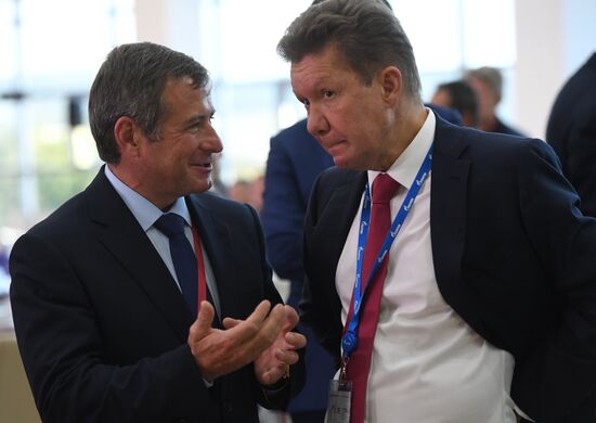 September 6, 2017. Gazprom Board Chairman Alexei Miller, right, and Grigory Beryozkin, chairman of the directors' board at ESN Group, before a meeting of the Presidium of the State Council. The Far Eastern Federal University, Russky Island.06.09.2017#3186773