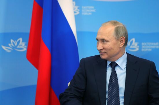 September 6, 2017. Russian President Vladimir Putin during a meeting with President of South Korea Moon Jae-in as part of the 3rd Eastern Economic Forum hosted by the Far Eastern Federal University, Russky Island.06.09.2017#3185883