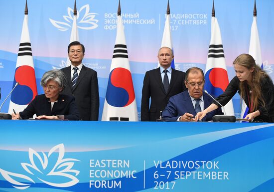 September 6, 2017. Russian Foreign Minister Sergei Lavrov and Minister of Foreign Affairs of South Korea Kang Kyung-wha at the ceremony to sign documents on the results of the meeting between Russian President Vladimir Putin and President of South Korea Moon Jae-in held as part of the 3rd Eastern Economic Forum at the Far Eastern Federal University, Russky Island.06.09.2017#3186064