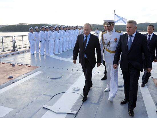 September 6, 2017. Russian President Vladimir Putin and Khabarovsk Territory Governor Vyacheslav Shport, left, inspect corvette Sovershenny of project 20380 moored at Ayaks Bay near Russky Island.06.09.2017#3186452