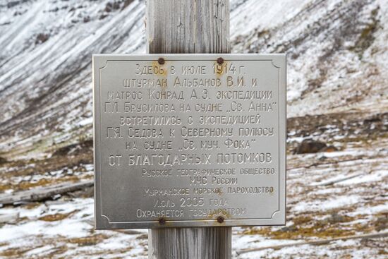Memorial sign in honor of the Yermak Icebreaker's feat of August 9, 1901. Cape Flora of the Yuri Kuchiyev Island (before the separation of the island by the strait, the Island of Northbrook). Russian Arctic National Park.23.08.2017#3238477