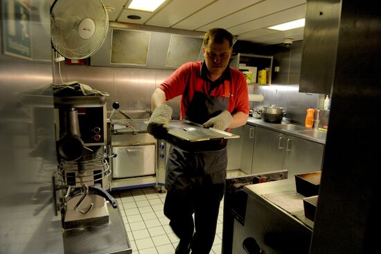 Cooking food in the galley of seiner trawler "ASBJORN" operated by Yuzhno-Kurilsky Fish Factory on a fishing mission off Kunashir Island.24.12.2017#3284552