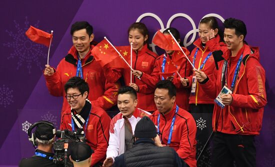 Center, background: Yan Han (China) during the announcement of the skater's results of performance of his short program during the men’s figure skating team competition at the XXIII Olympic Winter Games in PyeongChang.09.02.2018#3291613