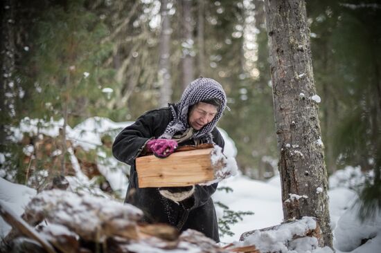 Agafia Lykova, a hermitess from the old Believer family, splits firewood. The Lykov family of Old Believers went to the Sayan mountains taiga in the later 1930s, resided in isolation and were discovered by Soviet geologists in 1978. Agafia Lykova is currently the only survivor of the Lykovs.19.02.2018#3314178
