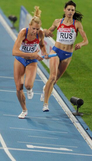 From right: Russia's Yuna Mekhti-Zade passing a relay to Aleksandra Fedoriva during women's 4 x 100 m relay race at the European Athletics Championships in Barcelona.01.08.2010#733107