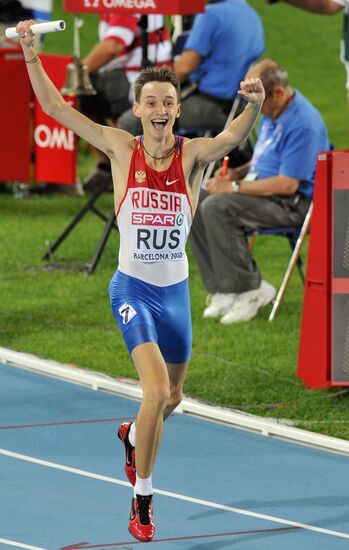 Vladimir Krasnov, right, in the men's 4x400m relay. The Russian national team, Maksim Dyldin, Alexei Aksyonov, Pavel Trenikhin and Vladimir Krasnov, won the men's 4x400m relay at the European Athletics Championships.02.08.2010#733067