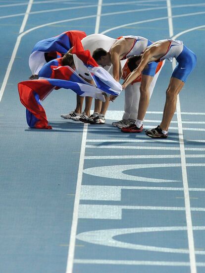 From left: Russia's Maksim Dyldin, Alexei Aksyonov, Vladimir Krasnov and Pavel Trenikhin won the men's 4x400m relay at the European Athletics Championships.02.08.2010#733076