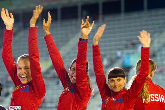 From left: Anastasiya Kapachinskaya, Antonina Krivoshapka, Kseniya Ustalova, and Tatyana Firova won the women's 4x400m relay at the European Athletics Championships.01.08.2010#733059