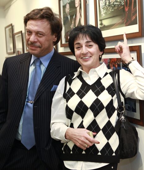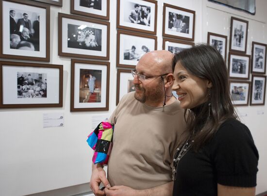 Photo correspondent Valery Levitin posing for a photograph at an opening of his exhibition "Full Version" at the Center of Photography of the Lumiere brothers. Right: TV host Tatyana Vedeneeva.07.12.2010#819581