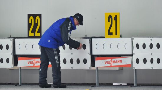 Stadium employee changes targets during the men's 10 km sprint at the E.ON IBU World Cup Biathlon 5 in Ruhpolding, Germany.14.01.2011#839662