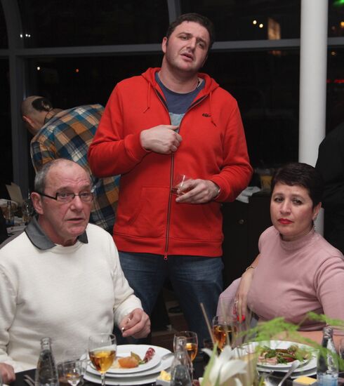 Emanuel, Maxim and Irina Vitorgan pose for a photographer at the party on the anniversary of "Quartet And" theater.24.03.2011#891093