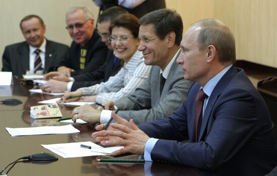 Russian Prime Minister Vladimir Putin, center, meets with the trade union members at the Scientific and Research Institute for Physical Measurement Techniques, April 29, 2011. 2nd right: Russia's Independent Unions Federation president Mikhail Shmakov. 3rd left: Deputy Prime Minister Alexander Zhukov.29.04.2011#905717