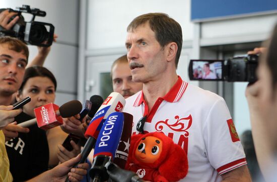 Head coach of Russia Boris Sokolovsky answers journalists' questions at Vnukovo-3 airport. The Russian Women's basketball team won the European basketball championship in Poland and qualified for the Olympic Games in 2012.04.07.2011#930512