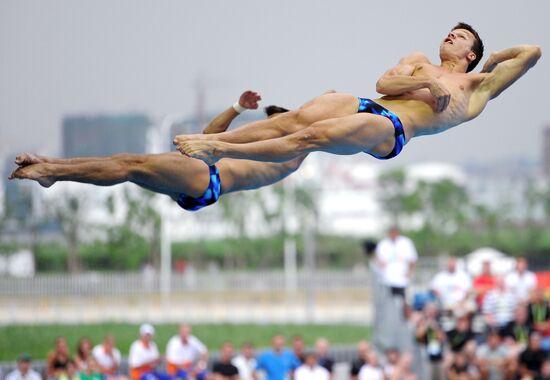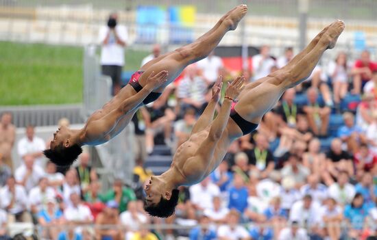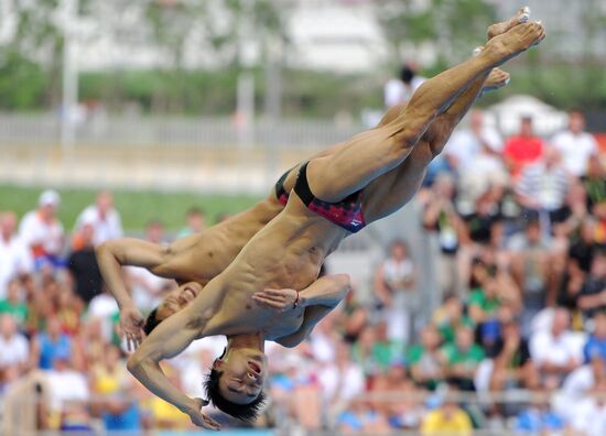 Ukraine's Oleksandr Gorshkovozov, Oleksandr Bondar perform in men's 3 m springboard synchro diving.19.07.2011#935662