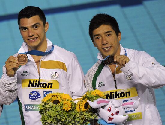 Mexico's Yahel Castillo and Julian Sanchez, bronze winners in men's 3 m springboard synchro diving, during the awarding ceremony.19.07.2011#935616