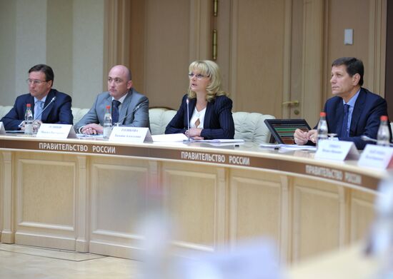 From left: Russian Healthcare and Social Development Minister Tatyana Golikova, Deputy Prime Minister Alexander Zhukov and Presidential Adviser Mikhail Trinoga during a video conference on the implementation of the priority national projects "Healthcare" and "Education" in the first half of 2011.26.07.2011#938132