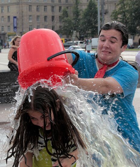 Participant of the flash mob "Water Battle, or Let's Cool St Pete to a Northern Capital Temperature" pours water onto a girl on Moskovskaya Square, St Petersburg.29.07.2011#939406