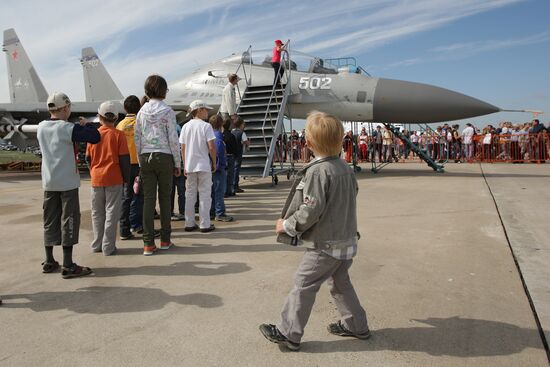 Young visitors at the MAKS-2011 air show line up to take a look at a Sukhoi Su-30 MK fighter.19.08.2011#946193