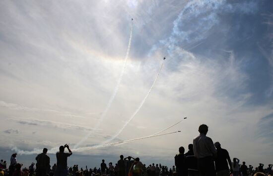 Visitors watch Yak-52 and Yak-54 trainer aircraft of the First Flight aerobatic team performing a demonstration flight during the MAKS-2011 international air show.19.08.2011#946249