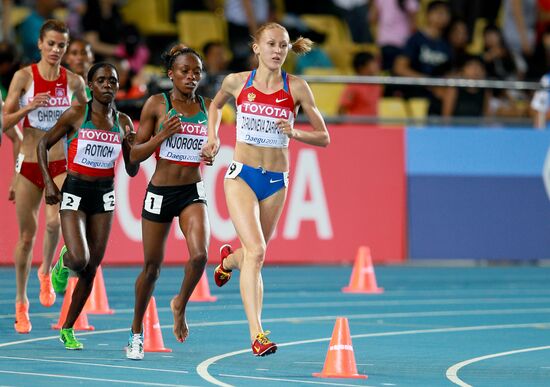 Russian athlete Elizabeta Grechishnikova (center) runs in the qualifying race of 5,000 meters at the World Athletics Championships in Daegu, South Korea.30.08.2011#950454