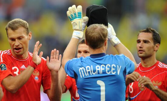 Russian players Vyacheslav Malafeev (foreground) and Igor Denisov, Alexander Kerzhakov, Roman Shirokov, Roman Pavlyuchenko and Alexander Anyukov (left to right background) in the qualifying European Football Championship match between the national teams of Russia and Macedonia.02.09.2011#952681