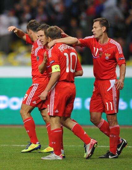 Russian players Andrei Arshavin and Alexander Kerzhakov (left-right) celebrate after scoring a goal in the qualifying European Football Championship match between the national teams of Russia and Macedonia.02.09.2011#952581