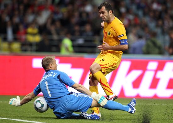 Vyacheslav Malafeev (Russia) and Goran Pandev (Macedonia) (left to right) in the qualifying European Football Championship match between the national teams of Russia and Macedonia.02.09.2011#952668
