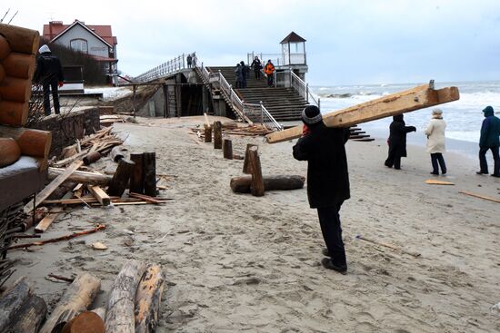 Workers and local residents eliminate consequences of a night storm that hit Baltic Sea's coastal areas near the resort town of Zelenogradsk, destroying wooden coffeehouses and other seasonal facilities.15.01.2012#1014615