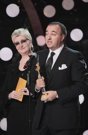 Director Sergei Glezin, right, the Golden Eagle award winner for his cartoon The Three Bogatyrs and Queen of Shamakhan, at the Golden Eagle Awards ceremony in Moscow. Left: Actress Liza Arzamasova.27.01.2012#1023576