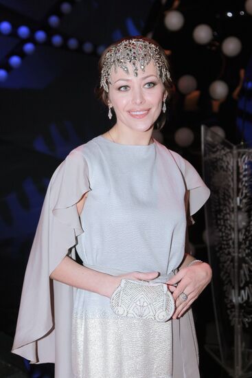 From left: Actors Nonna Grishayeva, Olesya Sudzilovskaya, and Mikhail Politseimako, at the Golden Eagle award ceremony, Moscow.27.01.2012#1023593